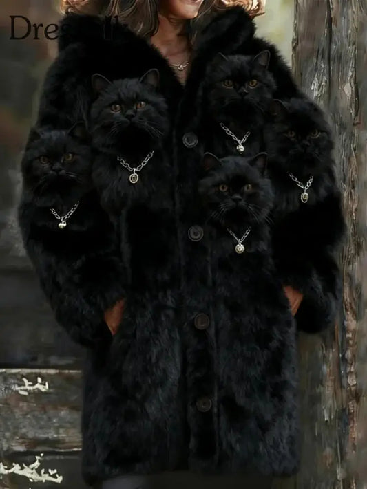 Damen Tier Katze Print Flanell Warme Jacke