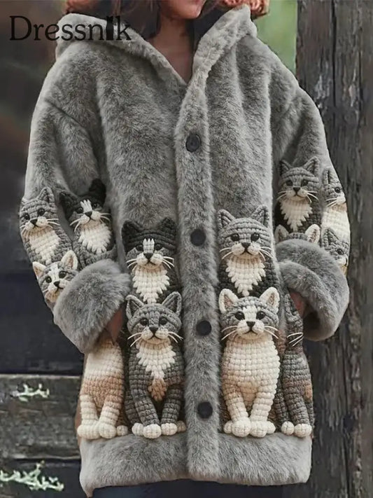 Damen Tier Katze Print Flanell Warme Jacke