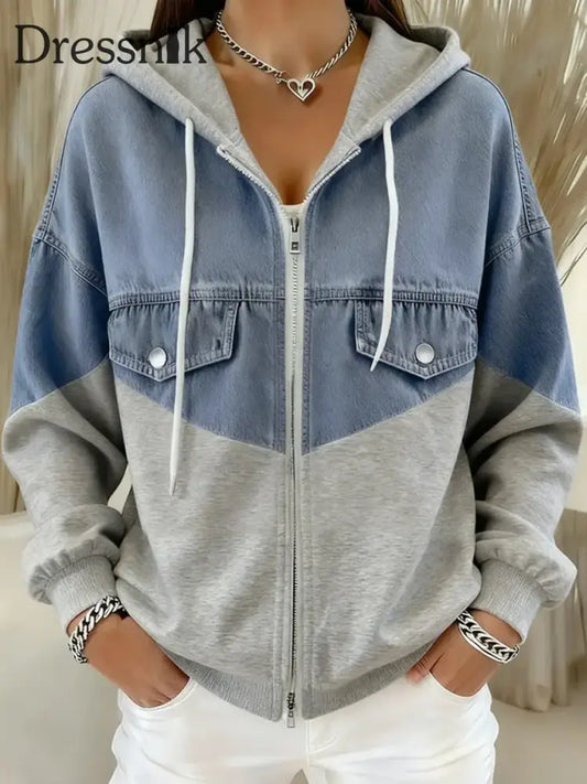 Damen-Patchwork-Hoodie mit Reiß verschluss