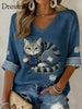 Damen Retro Niedliche Katze Denim Patchwork Kunstdruck Lässiges Langarm T-Shirt